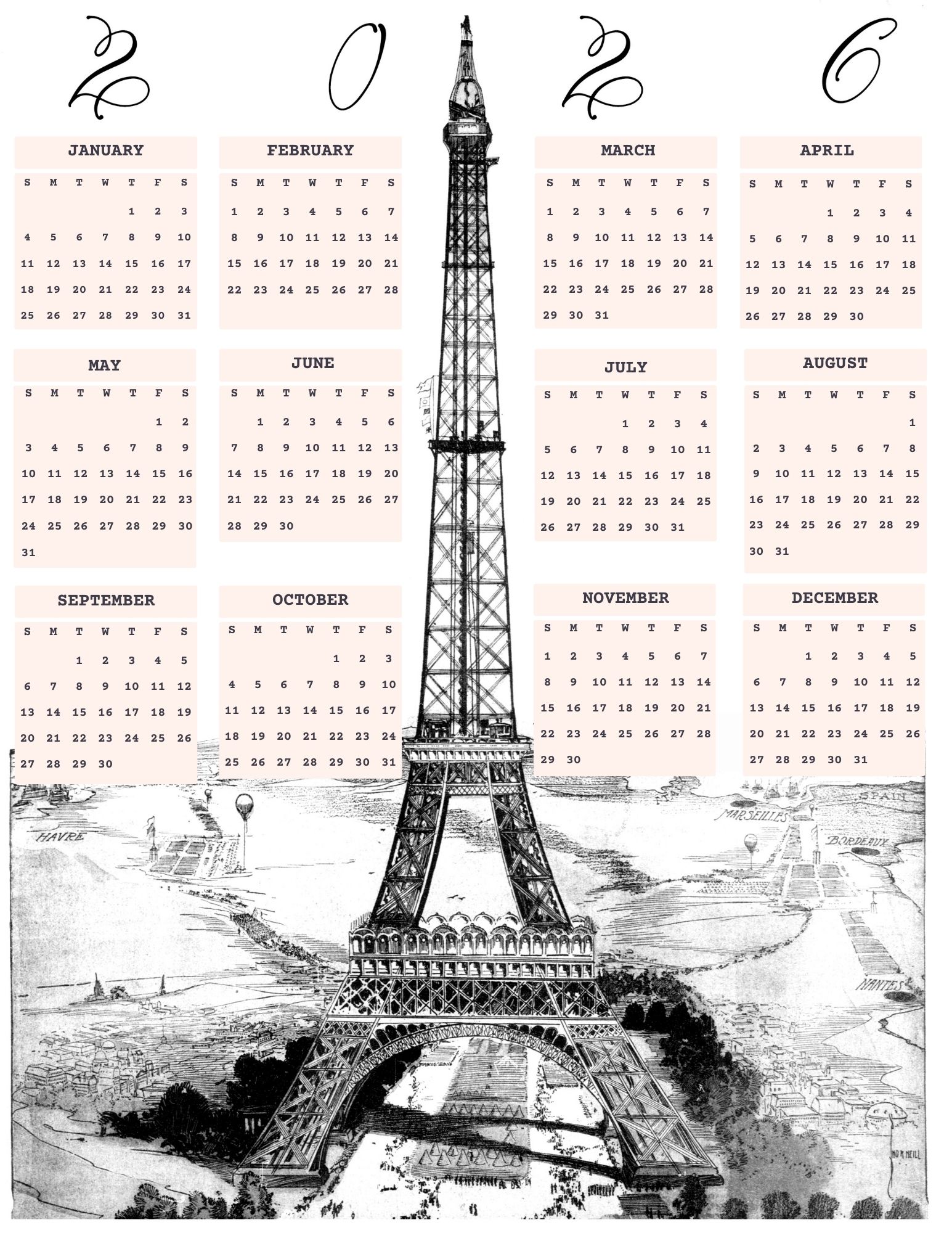Free Printable 2026 Calendar – Vintage Paris Edition