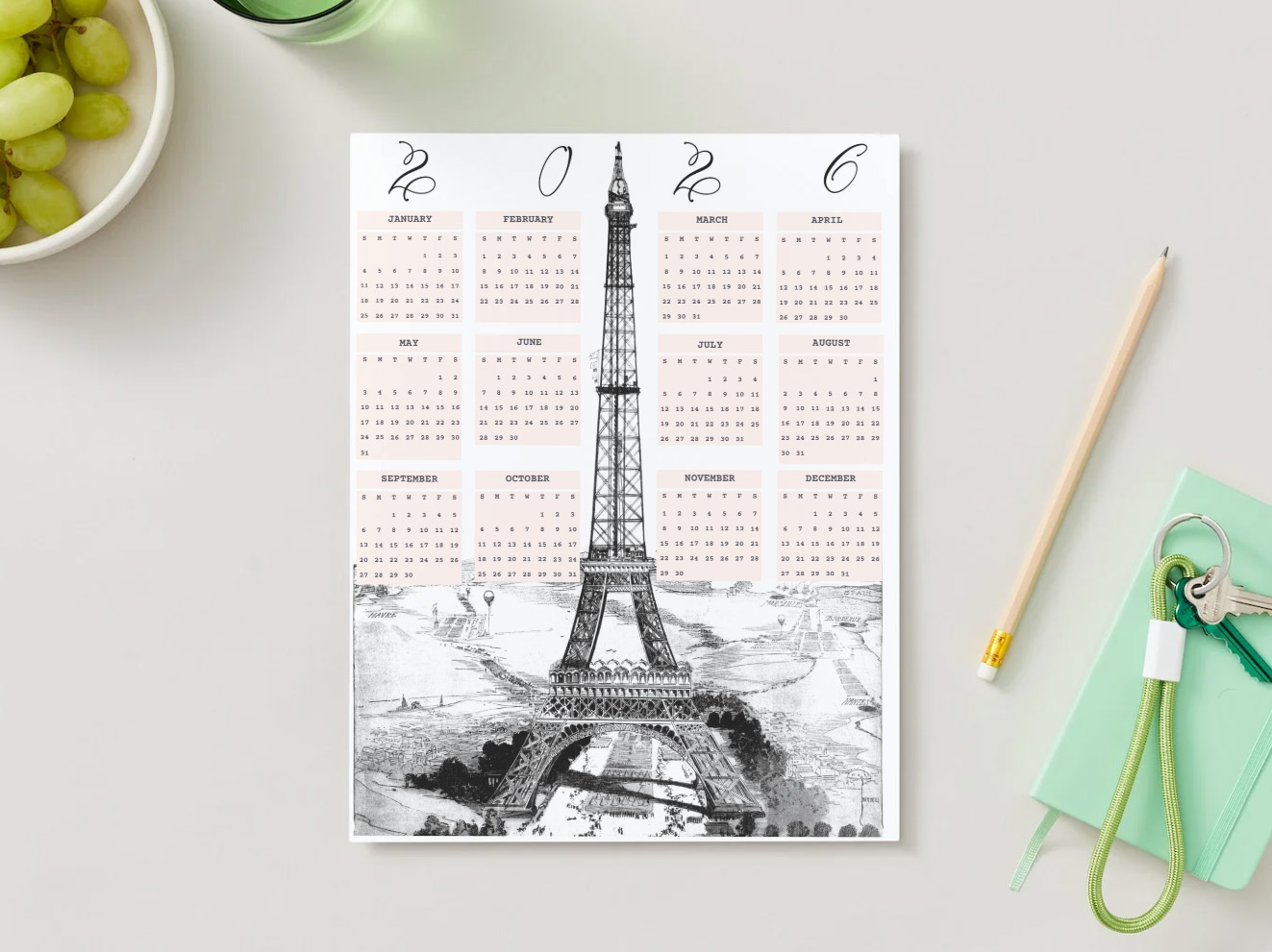 Designed for easy printing, one sheet on letter paper to post on the wall showing the whole year. Whether you’re a lover of Paris, vintage décor, or minimalist planning, this calendar makes a stylish and practical addition to your space.